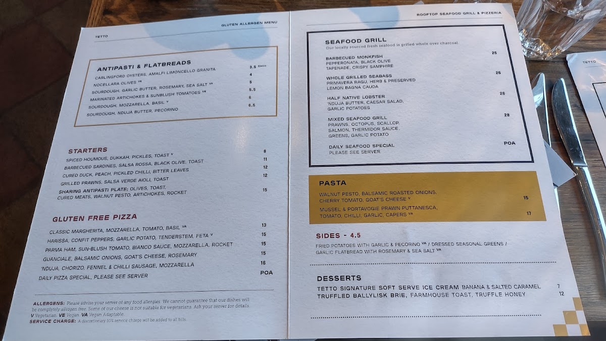 The menu doesn’t just stop at pasta; the Antipasti & Flatbreads share a spotlight as well. The highlights include their flavorful Sourdough with Mozzarella and Basil at £6.00, and Nduja Butter with Pecorino for £6.50. And let’s not forget the Carlingford Oysters served with Amalfi limoncello granita, a stunning combination at only £3.50.